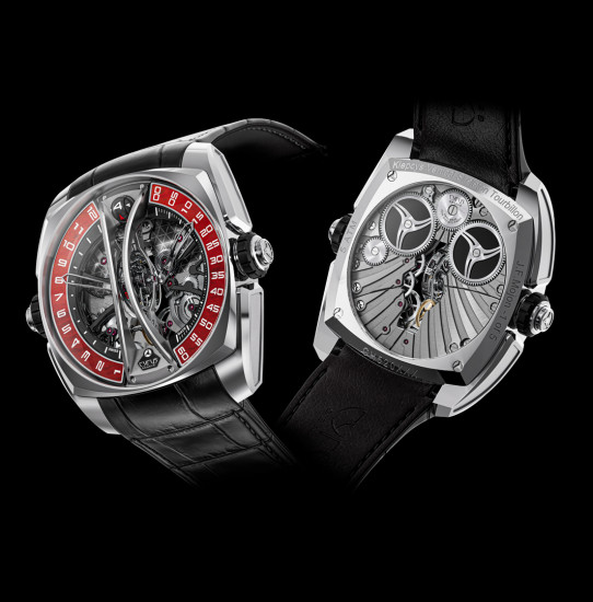 The 3-D architecture of the dial, also in a skeletonized version, is enhanced by the arch of the vertical bridge. Inspired by Leonardo Da Vinci’s design principles, the bridge blends harmoniously with the symmetrical lines of the timepiece and accentuates the central tourbillon. This provides easy access to admire the tourbillon as it completes a full rotation every minute.